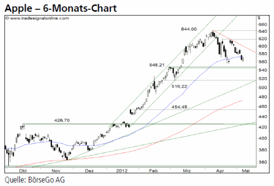 Ausblick: Aktuell deutet aus unserer Sicht vieles darauf hin, dass die Korrektur weiter andauern dürfte. Allerdings bestehen gute Chancen, dass es den Käufern gelingen kann, bei 548,21 USD eine Bodenbildung einzuleiten. Die Long-Szenarien: Verbleiben die Apple Aktien entsprechend über dieser Marke, dürfte sich eine weitere Aufwärtsbewegung bis 618,00 USD vollziehen. Ein Ausbruch über diese Hürde würde bereits ein kurzfristiges Kaufsignal mit einem Ziel bei 644,00 USD auslösen. Kann auch das Allzeithoch nachhaltig durchbrochen werden, sind Zugewinne bis 680,00 USD und darüber bis auf 700,00 USD denkbar. Die Short-Szenarien: Erst ein deutlicher Bruch der 548,21 USD-Marke auf Tagesschlusskursbasis würde ein kurzfristiges Verkaufssignal nach sich ziehen. In diesem Fall könnten die Aktien zunächst bis 516,22 USD abfallen. An dieser Stelle könnte sich nach unserer Einschätzung bereits die nächste Aufwärtsbewegung vollziehen. Kann diese Marke dagegen nicht zu einem Wiederanstieg genutzt werden, sind erhebliche Verluste bis 470,00 USD und darunter bis 454,45 USD möglich.