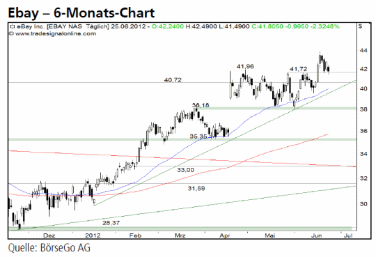 Rückblick: Die Aktien von Ebay befanden sich nach einem steilen Anstieg bis 35,35 USD während des gesamten Jahres 2011 in einer Konsolidierungsphase auf hohem Niveau.