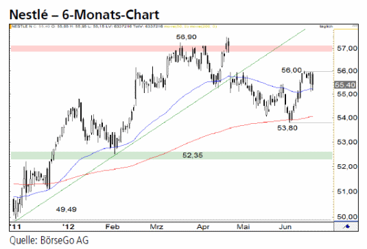 Ausblick: Die Aktien von Nestlé könnten derzeit mit einem weiteren Anstieg die Korrektur seit April beenden. Im Anschluss stünden bereits neue Allzeitshochs auf der Agenda. Die Long-Szenarien: Bricht der Wert über den Widerstand bei 56,00 CHF aus, dürfte sich der jüngst eingeschlagene Aufwärtstrend bis zum Widerstand bei 56,90 CHF und dem Allzeithoch bei 57,50 CHF fortsetzen. Hier wäre mit einer weiteren kurzzeitigen Korrektur zu rechnen. Steigen die Aktien von Nestlé auch über diese Marke an, kann sich die Aufwärtsbewegung bis 61,00 CHF fortsetzen. Auf mittlere Sicht wären Zugewinne bis 64,50 CHF möglich. Die Short-Szenarien: Ein Scheitern an 56,00 CHF würde zunächst eine leichte Korrektur bis 54,50 CHF auslösen. Von dort könnte sich bereits die nächste Kaufwelle anbahnen. Bearish wäre nach unserer Auffassung derzeit ohnehin erst ein nachhaltiger Rücksetzer unter das Tief bei 53,80 CHF zu werten. In diesem Fall wäre der Ausbruchsversuch der Bullen vorerst gescheitert und Verluste bis zur wichtigen Unterstützung bei 52,35 CHF die Folge. Sollte auch diese Haltemarke den Bären zum Opfer fallen, drohen auf mittlere Sicht bereits Abgaben bis 49,49 CHF.