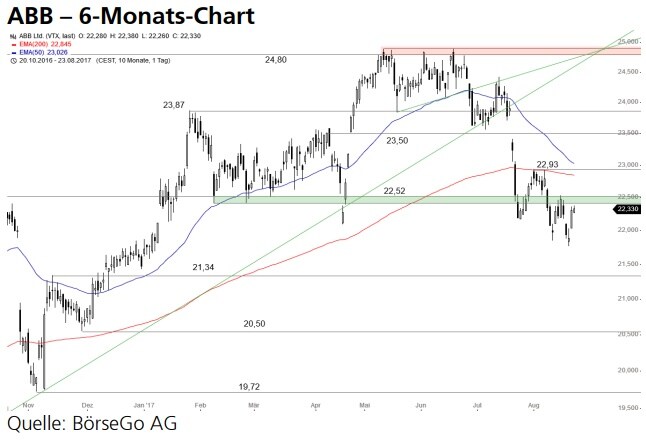 Seit einem bullishen Doppelboden an der 15,94 CHF-Marke, der im Januar 2016 ausgebildet wurde, befinden sich die Aktien von ABB in einem soliden Aufwärtstrend, der den Wert in den vergangenen Monaten bis an das Hoch des Jahres 2014 bei 24,80 CHF geführt hatte.