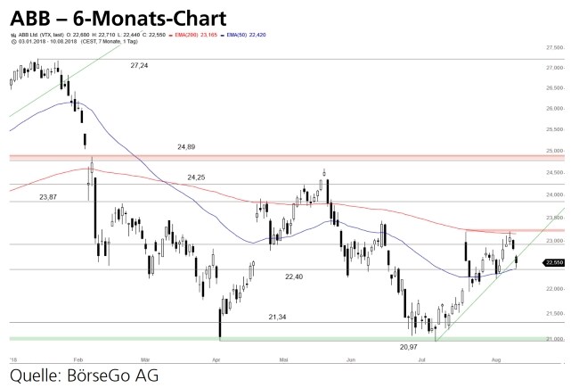 Rückblick: Bis Ende April befanden sich die Aktien von ABB in einer extrem steilen Abwärtsbewegung, die nach dem Bruch einer kurzfristigen Aufwärtstrendlinie im Januar begann und in der Spitze bis knapp unter die Unterstützung bei 21,34 CHF führte.