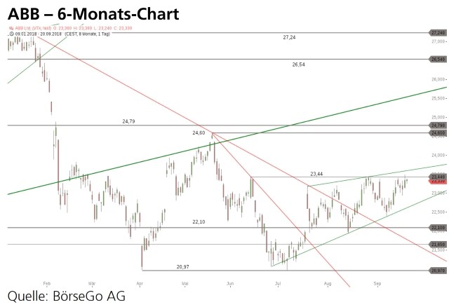 Rückblick: Die Aktien von ABB erreichten noch im Januar 2018 ein neues Rekordhoch bei 27,24 USD, um dann ausgehend von der Oberkante des mittelfristigen Trendkanals deutlich unter Druck zu geraten.