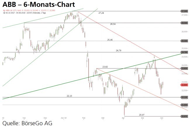 Ausblick: Mit dem zuletzt gegebenen Rückfall wurde der Bruch des mittelfristigen Aufwärtstrends bei ABB bestätigt, was noch umfassende Abgaben nach sich ziehen könnte. Im Einzugsbereich der langfristig relevanten Unterstützung bei 22,10 CHF wäre hingegen die Chance gegeben, eine Bodenbildung einzuleiten. Die Long-Szenarien: Ausgehend von der 22,10 CHF-Marke wäre wieder ein Anstieg in Richtung der starken Widerstandszone zwischen der 23,82 CHF-Marke und der 24,79 CHF-Marke möglich. Erst oberhalb der 24,79 CHF-Marke, bei einer Rückeroberung des Aufwärtstrends, könnte die Käuferseite mittelfristig übernehmen. Mit einem Zwischenziel an der 25,46 CHF-Marke düre auch das Verlaufshoch bei 27,24 CHF wieder erreichbar werden. Die Short-Szenarien: Bereits nach der leichten Stabilisierung der Vortage wäre eine Ausdehnung der Korrektur bis zur 20,97 CHF-Marke möglich. Hier düre sich eine klare Reaktion der Bullen bieten, welche auch die Basis für einen Boden bilden könnte. Sollte ABB aber unter die 20,97 CHFMarke rutschen, wäre die Möglichkeit gegeben, die Korrektur nachhaltig auszudehnen. Im Zuge einer zweiten grossen Abwärtswelle könnte dann zunächst die 19,72 CHF-Marke und im weiteren Verlauf auch die 18,00 CHF-Marke erreichbar werden.