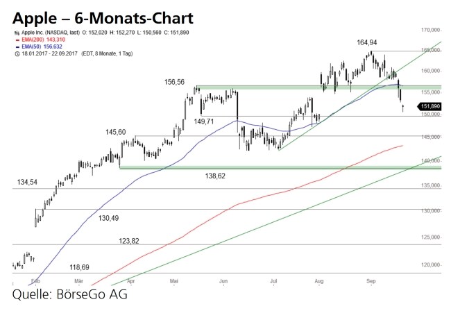 Rückblick: Die Aktien von Apple mussten in den letzten Tagen eine steile Abwärtsbewegung verkraften, die den Wert ausgehend von einem neuen Allzeithoch bei 164,94 USD unter die vorherige Rekordmarke bei 156,56 USD drückte.