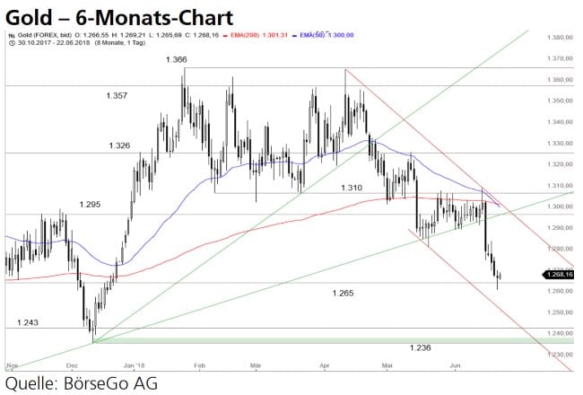 Ausblick: Auf dem aktuellen Niveau besteht die theoretische Chance, dass die Abwärtsbewegung seit Anfang April endet. Die Dynamik der letzten Tagen spricht allerdings weiter für fallende Kurse. Die Short-Szenarien: Wird die 1.265 USDMarke jetzt ebenfalls deutlich gebrochen, dürfte sich der Abwärtstrend bei Gold bis an die Unterstützungszone von 1.236 bis 1.243 USD ausdehnen. Dort hätten die Bullen jedoch gute Chancen, eine mittelfristige Trendwende einzuleiten. Wird die Marke dagegen ebenfalls durchbrochen, stünde ein Kursrutsch bis 1.200 USD an. Die Long-Szenarien: Gelingt es der Käuferseite dagegen, den Bereich um 1.265 USD zu verteidigen und den Goldpreis anschliessend wieder über die 1.280 USDMarke zu heben, wäre eine Erholung bis 1.295 USD möglich. Damit wäre der Abwärtstrend aber noch nicht beendet. Auf diesem Niveau könnte der nächste mehrtägige Abwärtsimpuls beginnen. Bei einem Anstieg über 1.295 USD wäre der Kursrückgang seit Mitte Juni neutralisiert und in der Folge wären weitere Zugewinne bis 1.310 USD möglich. Doch erst mit Kursen über dieser Hürde wäre der Abwärtstrend unterbrochen und ein Anstieg bis 1.325 und 1.357 USD wahrscheinlich.