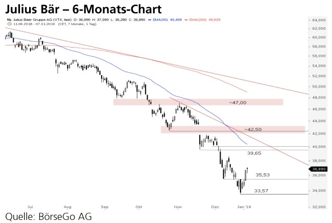 Umkehrformation im Wochenchart. Die Long-Szenarien: Sollten die Aktien von Julius Bär in den