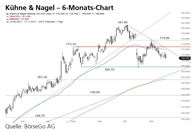 Rückblick: Nach einer kurzen Konsolidierung im Bereich der 138,00 CHF-Marke setzten die Aktien von Kühne & Nagel ihren langfristigen Aufwärtstrend ab Mitte April weiter fort und stiegen über die 148,70 CHF-Marke an.