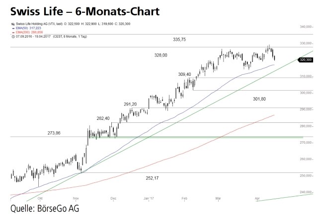 Rückblick: Im November des Vorjahres brachen die Aktien von Swiss Life über das Hoch des Jahres 2015 bei 273,86 CHF aus und setzten in der Folge dieses starken Kaufsignals einen mittelfristigen Aufwärtstrend fort.