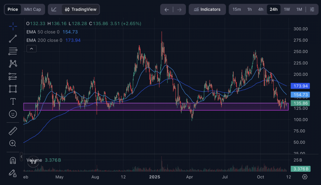 Im Bereich zwischen 120 und 135 Dollar kam es in der Vergangenheit mehrmals zu einer starken Erholung, sodass sich hier eine starke Supportzone gebildet hat. Aktuell sieht es stark danach aus, als würde dies Zone auch diesmal wieder halten, wobei $SOL bereits am oberen Ende dieses Bereichs notiert. Das könnte einen schnellen Anstieg nach sich ziehen.