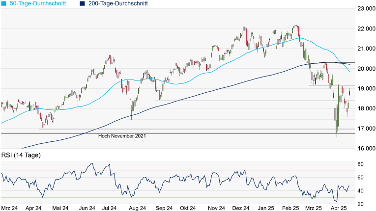 Die US-Börsen haben ihre Erholung zur Wochenmitte fortgesetzt. Vor allem Tech-Werte waren erneut gefragt - der technologielastige NASDAQ-100 rückte um weitere 417 Punkte oder 2,28 Prozent auf 18.693 Punkte vor. Wie am Vortag lieferten Entspannungssignale im US-Zollstreit mit China kräftigen Rückenwind. Einem Medienbericht zufolge könnten die US-Zölle auf Waren aus China auf 50 bis 65 Prozent gesenkt werden. Verhandlungen gab es laut US-Finanzminister Scott Bessent jedoch noch keine, was