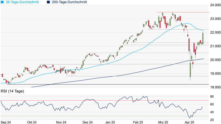 Die Anleger am deutschen Aktienmarkt waren gestern in Party-Stimmung - der Leitindex DAX rückte um kräftige 668 Punkte oder 3,14 Prozent auf 21.962 Punkte vor. Sogar die Marke von 22.000 Punkten konnte der DAX gestern zwischenzeitlich überqueren, ehe gegen Handelsende noch leichte Gewinnmitnahmen einsetzten. Kurstreiber Nummer eins waren auch hier die Entspannungssignale im US-Zollstreit mit China. Doch es gab auch einige erfreuliche Unternehmensberichte. So konnten etwa der