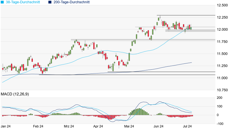 letzteres lediglich hauchdünn. Dennoch hat sich aus charttechnischer Sicht weiteres Kurspotenzial bis zum Juni-Hoch bei 12.295 Punkten eröffnet. Sollte die 12.000er-Marke hingegen doch fallen, würde sich bei einem Unterschreiten des jüngsten Verlaufstiefs bei 11.920 Punkten weiteres Korrekturpotenzial bis zum März-Hoch bei 11.800 Punkten eröffnen.