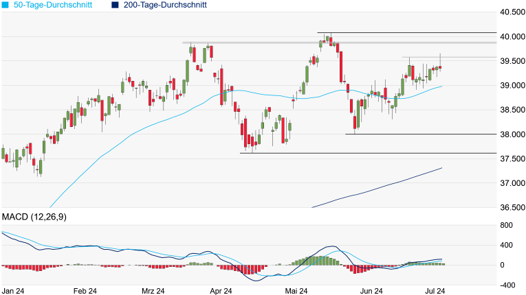 Impulse könnten die Ereignisse der kommenden Tage liefern. Allerdings könnten die Impulse auch negativ sein. In diesem Fall müsste sich der Dow möglicherweise abwärts orientieren. Die nächste signifikante Unterstützung wartet am aktuell bei 38.981 Punkten verlaufenden 50-Tage-Durchschnitt.