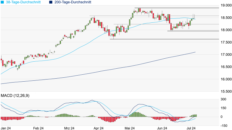 Punkten. Wird hingegen die 38-Tage-Linie unterschritten, könnten die Hochpunkte vom 29. und 24. April bei 18.236/18.226 Punkten noch einmal in den Fokus rücken, ehe das jüngste Verlaufstief bei 17.951 Punkten angesteuert werden könnte.