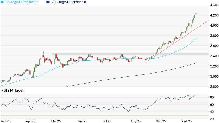 Charttechnik: Der Goldpreis kennt seit Wochen nur eine Richtung: nach oben. In den frühen Morgenstunden setzte das Edelmetall bei 4.233 US-Dollar abermals eine neue historische Bestmarke, womit das Plus seit Jahresbeginn auf über 61 Prozent angewachsen ist. Gold steuert damit weiter auf sein bestes Jahresergebnis seit 1979 zu - damals hatte sich der Goldpreis innerhalb eines Jahres mehr als verdoppelt. Ob Kurse von 5.000 oder gar 10.000 Dollar realistisch sind, ist schwer zu sagen. Aktuell gibt es zumindest mehr Argumente für weiter steigende Notierungen als dagegen. Doch jeder Höhenflug endet irgendwann. Sollte der Höhenflug bei Gold enden, wäre die Fallhöhe immens, denn zuletzt ging es fast wie an der Schnur gezogen aufwärts. Eine erste Unterstützung dürfte der seit August beschleunigte Aufwärtstrend darstellen, der aktuell bei etwa 3.935 Dollar verläuft. Denkbar wäre aber auch, dass der aktuell bei 3.753 Dollar verlaufende 38-Tage-Durchschnitt noch einmal angesteuert wird.