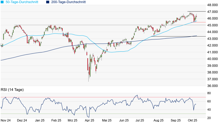 Charttechnik: Der Dow Jones hat jüngst noch einmal den Kopf aus der Schlinge gezogen. Am vergangenen Freitag schloss der US-Leitindex hauchdünn unterhalb seines aktuell bei 45.646 Punkten verlaufenden 50-Tage-Durchschnitts, womit sich das kurzfristige Chartbild wieder etwas gravierender eingetrübt hatte. Doch mit einer starken Reaktion am Montag, konnte der Dow den vielbeachteten Durchschnitt zurückerobern und sich seither auch darüber behaupten. Der Weg bis zum erst kürzlich bei 47.050 Punkten erreichten Rekordhoch ist damit unverbaut. Geht es darüber, dürfte der Traum vieler Anleger vom Erreichen der magischen 50.000-Punkte-Marke am Leben bleiben. Geht es hingegen noch einmal unter den 50-Tage-Durchschnitt und das jüngste Verlaufstief bei 45.471 Punkten, dürfte das Ausbruchsniveau bei 45.017/45.074 Punkten noch einmal in den Fokus rücken.