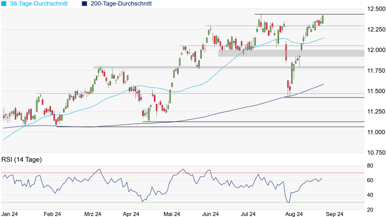 Trotz der jüngsten 1.000-Punkte-Erholung liegt noch keine überkaufte Marktphase vor. Kommt es dennoch zu Gewinnmitnahmen und wird das Juni-Hoch bei 12.295 Punkten wieder unterschritten, würde sich zunächst Korrekturpotenzial bis zum aktuell bei 12.149 Punkten verlaufenden 38-Tage-Durchschnitt eröffnen.