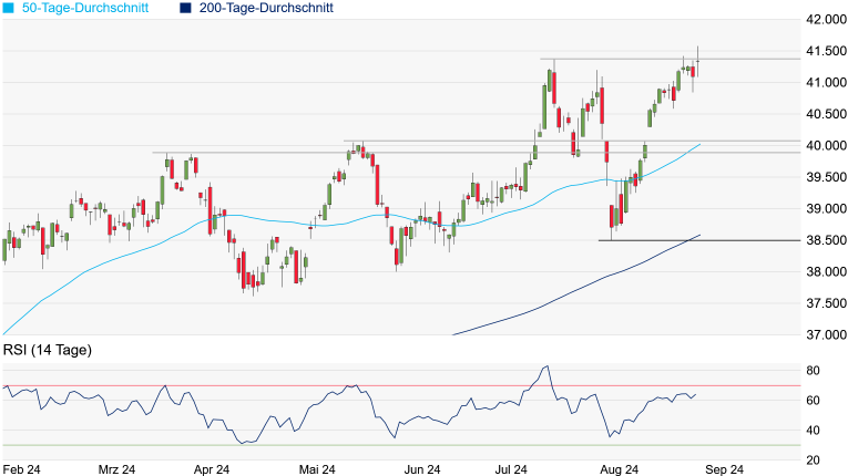 Quelle: Bloomberg. Bitte beachten Sie, dass aus der Wertentwicklung in der Vergangenheit nicht auf die zukünftige Wertentwicklung geschlossen werden kann. | | Charttechnik: Der Dow Jones hat gestern das Hoch vom 26. August bei 41.420 Punkten überquert und im Anschluss bei 41.558 Punkten ein neues Rekordhoch erreicht. Allerdings konnte der US-Leitindex dieses Niveau nicht verteidigen und fiel sogar wieder unter das Juli-Hoch bei 41.376 Punkten, womit sich das Chartbild letztlich noch nicht entscheidend aufgehellt hat. Gelingt jedoch der Ausbruch nach oben, würde sich zunächst naturgemäss reichlich Aufwärtspotenzial eröffnen. Geht dem Dow hingegen die Puste