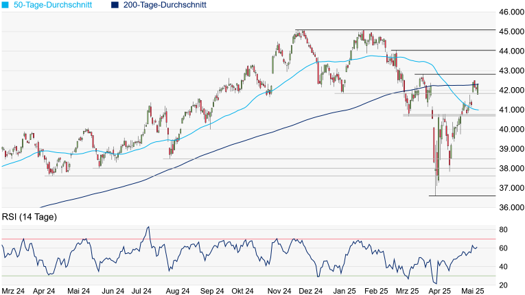 Punkten in den Weg stellen. Wird hingegen das Januar-Tief bei 41.845 Punkten wieder unterschritten - gestern eröffnete der Dow sogar darunter, ehe er sich kräftig erholen konnte -, könnte es durchaus noch einmal bis auf den aktuell bei 40.988 Punkten verlaufenden 50-Tage-Durchschnitt abwärts gehen.
