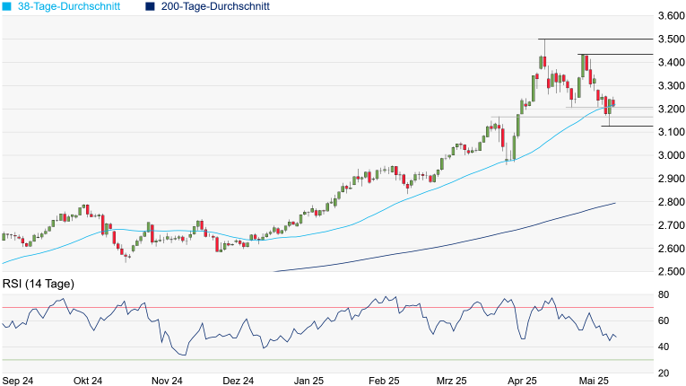 Goldpreis weiter stabilisieren, könnte eine Erholung bis an das Zwischenhoch vom 6. Mai bei 3.433 Dollar erfolgen, ehe auch das Rekordhoch wieder in den Fokus rücken könnte. Geht es jedoch weiter abwärts und wird das gestrige Tief bei 3.124 Dollar unterschritten, könnte das April-Tief bei 2.958 Dollar noch einmal in den Fokus rücken.