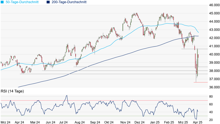 Auf der Oberseite dürfte das März-Tief bei 40.662 Punkten zunächst im Fokus stehen. Bei einem Überqueren würde sich weiteres Erholungspotenzial bis zum aktuell bei 42.205 Punkten verlaufenden 200-Tage-Durchschnitt eröffnen. Auf der Unterseite stellen sich mit den Tiefpunkten vom August bei 38.499 Punkten, vom 30. Mai bei 38.001 Punkten und April 2024 bei 37.612 Punkten noch einige Unterstützungen in den Weg, ehe das jüngste Korrekturtief bei 36.612 Punkten wieder in den Fokus rücken