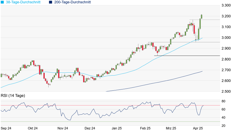 Prozent. Auf der Unterseite dürfte die 3.000-Dollar-Marke weiter im Fokus stehen. Sie könnte als solide Unterstützungen fungieren, da hier in etwa aktuell auch die 38-Tage-Linie verläuft.