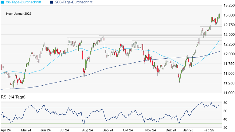überkaufte Marktphase spricht gegen weitere Kurssteigerungen. Auf der Oberseite hat der SMI nun erst einmal eine Menge Platz. Auf der Unterseite warten die ersten Unterstützungen am jüngsten Verlaufstief bei 12.756 Punkten und am Zwischenhoch vom 31. Januar bei 12.708 Punkten. Die erste signifikante Unterstützung taucht jedoch erst am August-Hoch bei 12.484 Punkten auf.