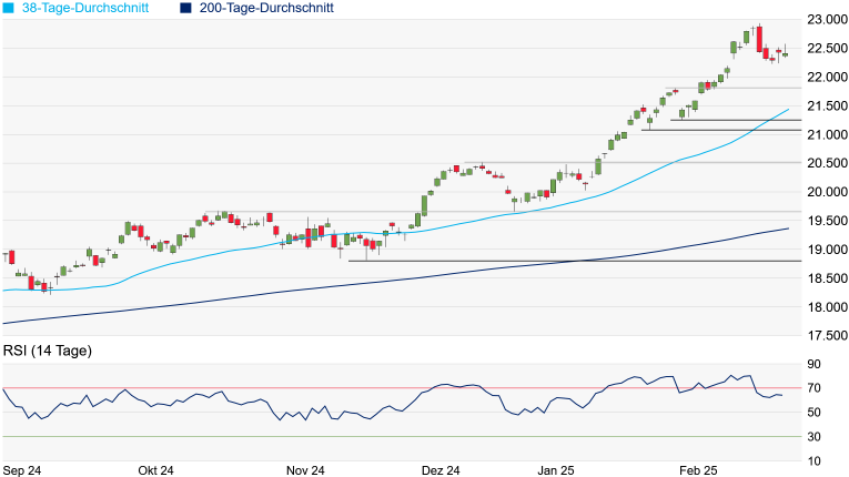 unterschritten, würde sich weiteres Korrekturpotenzial bis zum Zwischenhoch vom 31. Januar bei 21.801 Punkten eröffnen. Auf der Oberseite wäre weiterhin Platz bis zum Rekordhoch aus der Vorwoche bei 22.935 Punkten. Ein neues Hoch könnte mit neuem Kaufinteresse einhergehen. Allerdings liegt noch immer eine leicht überkaufte Marktphase vor, weshalb auch eine Fortsetzung der jüngst eingeleiteten Konsolidierung möglich erscheint.