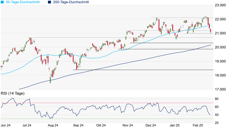 bei 20.975 Punkten unterschritten - das Tagestief lag bei 20.931 Punkten -, doch konnte sich der NASDAQ-100 bis zum Feierabend wieder komfortabel über die Marke von 21.000 Punkten retten. Setzt sich die Talfahrt fort, dürfte übergeordnet das Juli-Hoch bei 20.691 Punkten in den Mittelpunkt rücken. Das Chartbild würde sich hingegen erst wieder leicht aufhellen, wenn die 50-Tage-Linie zurückerobert wird.