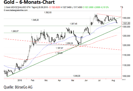 Rückblick: Der Goldpreis bewegt sich seit Dezember 2012 wieder in einem Aufwärtstrend und konnte mit dem Überwinden der 1.307,45 USD-Marke Ende Juni ein weiteres Kaufsignal aktivieren. Es gelang daraufhin der Anstieg bis zur 1.375,00 USD-Marke.