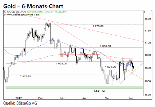 Jetzt informierenAusblick: Der Bereich um 1.625,00 USD bleibt die Demarkationslinie zwischen einem möglichen Rückfall auf das Tief Ende Mai und einer weiteren dynamischen Erholung. Die Long-Szenarien: Gelingt den Käufern der Ausbruch über 1.625,00 USD und wird dieser durch einen Anstieg über 1.640,00 USD bestätigt, wäre ein kurzfristiges Kaufsignal aktiv. Dieses könnte man entsprechend „long“ handeln. In der Folge dürfte das Edelmetall zunächst bis 1.680,00 USD ansteigen. Oberhalb dieser Marke könnte sich die eingeleitete Erholung bis 1.720,00 USD ausdehnen. Ein Anstieg über diese Barriere würde zugleich zum Bruch einer mittelfristigen Abwärtstrendlinie führen und somit ein weiteres Kaufsignal generieren. Die Short-Szenarien: Sollte der Goldpreis dagegen an 1.625,00 USD scheitern und im Anschluss deutlich unter 1.600,00 USD zurücksetzen, könnte ein weiterer Ausbruchsversuch erst über den Umweg einer Korrektur bis 1.576,52 USD einsetzen. Wird diese Unterstützung hingegen unterschritten, wäre ein Verkaufssignal gebildet worden. Im Anschluss dürfte Gold bis an das Jahrestief bei 1.521,12 USD abfallen. Dort könnte es zu einer ausgeprägten Bodenbildung kommen.