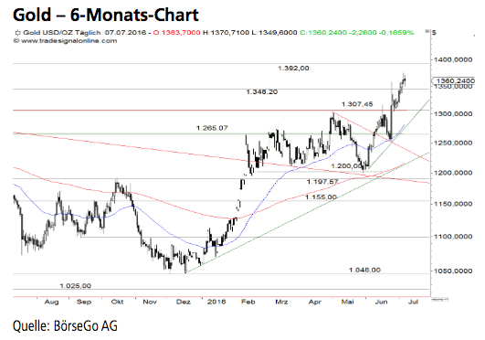 Jetzt informierenAusblick: Die Bullen haben sich durchgesetzt und den Goldpreis zu einem Ausbruch durch mittelfristig wichtige Widerstände geführt. Damit wurde auch der Rücklauf an die gebrochene Abwärtstrendlinie der vergangenen Jahre bullish beendet. Die Long-Szenarien: Nachdem die Barriere bei 1.348,20 USD überwunden wurde, besitzt Gold die Chance, zum relevanten Widerstand bei 1.392,00 USD zu steigen. Zuvor könnte noch eine Konsolidierung anstehen bis zur 1.307,45 USD-Marke. Erkennbar ist eine, vor allem auf mittelfristige Sicht starke Widerstandszone im Bereich der 1.431,45 USD-Marke. Diese könnte für die Käuferseite anziehend wirken und innerhalb der laufenden Rally noch erreichbar sein. Die Short-Szenarien: Kommt es im Falle eines Rücksetzers zu Abgaben unter die 1.307,45 USD-Marke, könnte die bullishe Entwicklung gefährdet werden. In diesem Fall besteht die Möglichkeit, dass der nach dem Brexit-Referendum erfolgte Anstieg korrigiert wird und sich der Wert wieder bis zur 1.250,00 USD-Marke bewegt. Unter dieser Haltemarke wäre auch die steilere Aufwärtsbewegung seit Anfang Juni unterbrochen, sodass Gold bis zur 1.220,00 USD-Marke abfallen könnte.