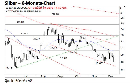 Das in der KeyInvest Daily Markets Analyse vom 22.11. beschriebene Short-Szenario hat weiterhin Bestand. Der Silberpreis droht in den letzten Tagen des Jahres noch neue Jahrestiefs auszubilden. Die Short-Szenarien: Der Tageschart zeigt einen seit August intakten Abwärtstrendkanal. Innerhalb dieses Kanals hat der Silberpreis noch Spielraum auf der Unterseite. Kurzfristig dürfte ein Test des Dezembertiefs bei 18,87 USD anstehen. Kann auch diese Chartmarke dem Verkaufsdruck der Bären nicht standhalten, dürfte Silber bis auf das Jahrestief bei 18,18 USD ausverkauft werden. Unterhalb dieser Marke wiederum lässt sich im Langfristchart erst bei 17,30 USD die nächste aussagekräftige Unterstützung herausfiltern. Die Long-Szenarien: Kurserholungen sind zwar jederzeit möglich, dürften aber kaum über den Widerstand bei 20,60 USD hinausgehen. Auf diesem Kursniveau notiert aktuell auch der EMA50. Erst darüber hätte der Silberpreis Luft für einen Anstieg bis zur oberen Trendkanalbegrenzung bei 21,35 USD.