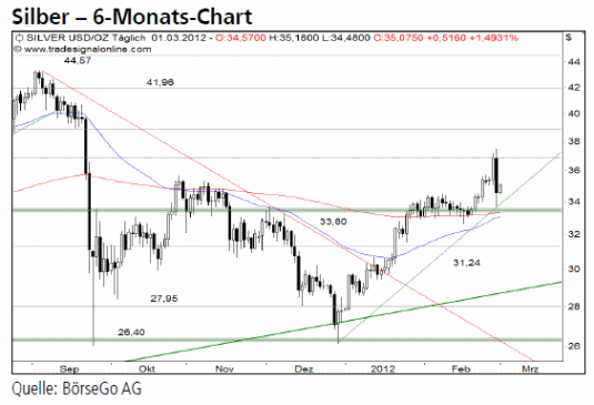 Rückblick: Der Silberpreis konnte sich seit Dezember 2011 ausgehend von der Unterstützung bei 26,40 USD deutlich erholen ...